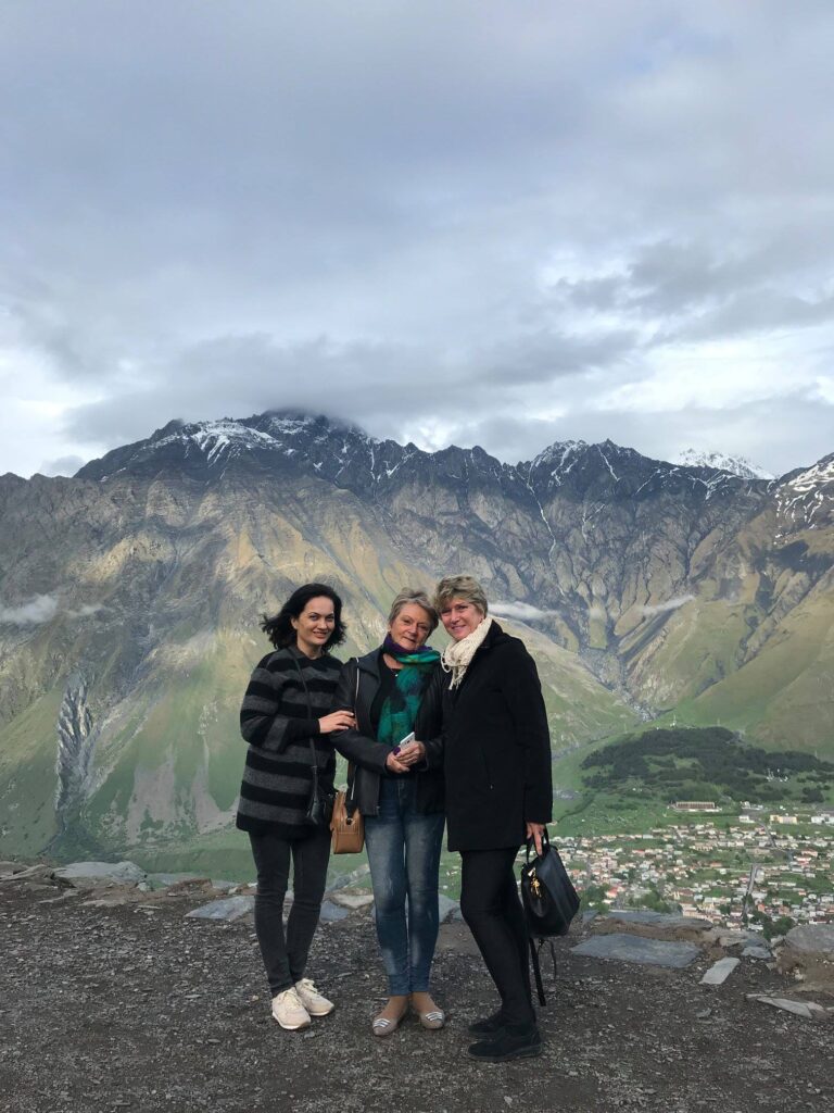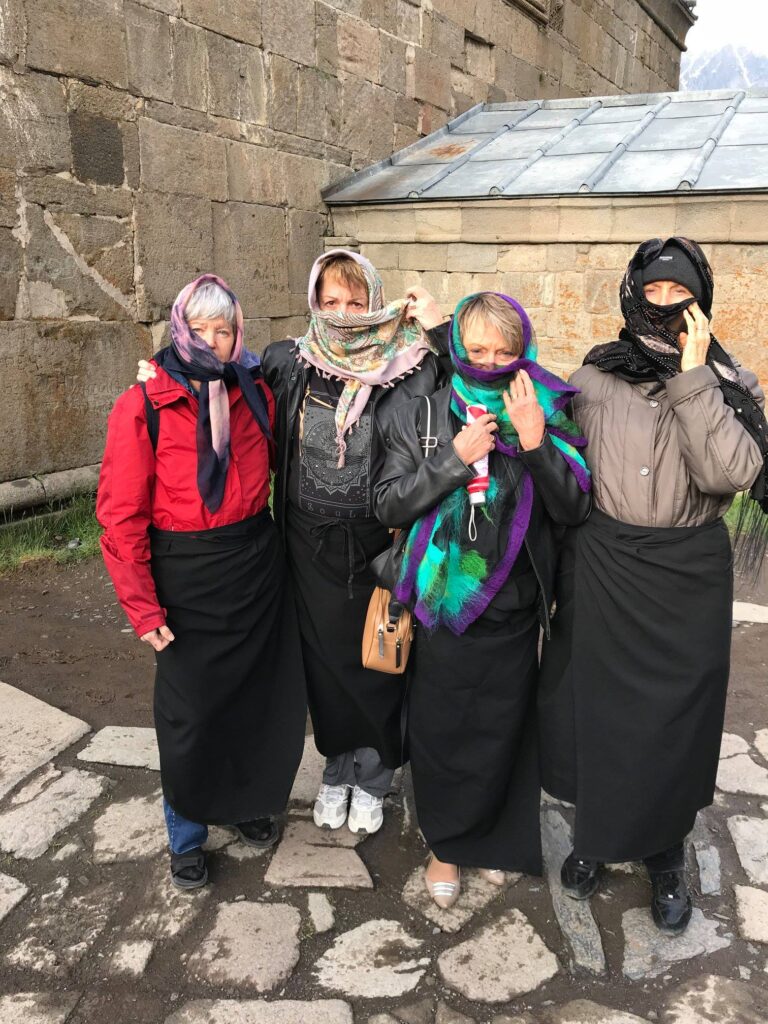 Em todas as igrejas georgianas tem lenços à disposição na entrada para as mulheres cobrirem a cabeça, Na Gergety Trinity Church tem também um baú com saias pretas para cobrir calças compridas e saias muito curtas. Abaixo o registro de nossa passagem por uma das mais belas igrejas do mundo com uma vista deslumbrante do vale e das montanhas do Cáucaso entre elas o monte Kazbek.