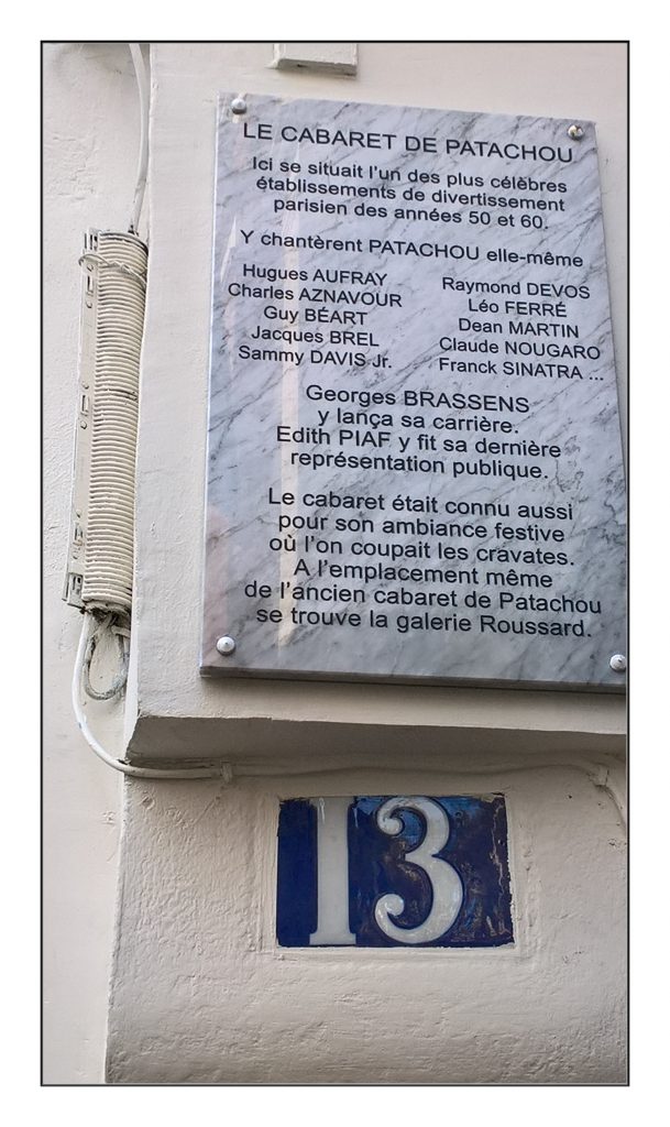 O Cabaret também acolheu outros nomes famosos da canção francesa. Edith Piaf se apresentou lá muito jovem e lá encerrou sua carreira cantando “La Vie em Rose”. Muitos artistas célebres como Jacques Brel, Charles Aznavour e Michel Sardou se apresentaram no Patachou. O Cabaret fechou em meados dos anos 70 mas sua dona continuou a carreira de sucesso internacional por muitos anos. Nascida em 1918 como Henriette Ragon morreu em 2015 aos 96 anos como a inesquecível Patachou.